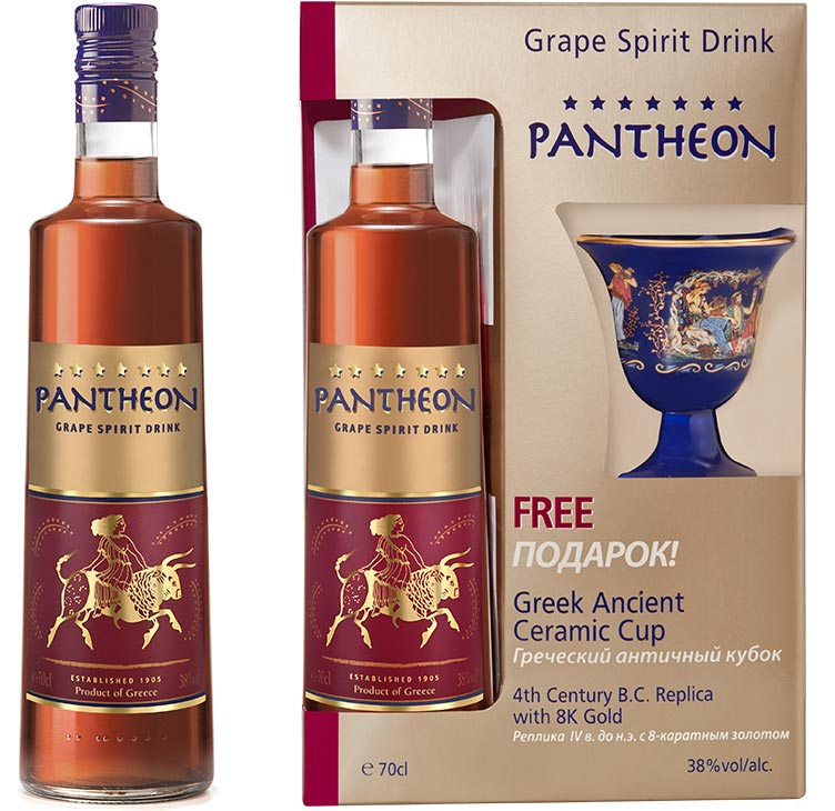 Этот уникальный напиток получил название «PANTHEON», как бы в напоминание о собрании богов, где они все вместе и благодаря особым характеристикам каждого в отдельности, представляют красоту, многообразие и равновесие мира. На этикетке «Pantheon» изображен царь всех богов Зевс в образе ослепительно красивого и сильного быка, несущего на своей спине принцессу Европу через Геллеспонт на материковую «Европу», так же, как и Греция когда-то распространила культуру изготовления дистиллятов и концепцию качественной и благополучной жизни.